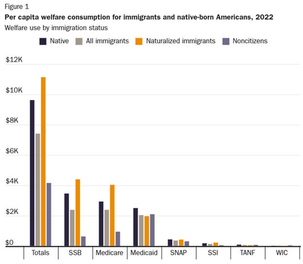 Based on data from the Survey of Income and Program Participation, we find that immigrants consumed 21 percent less welfare and entitlement benefits than native-born Americans on a per capita basis in 2022. Immigrants were 14.3 percent of the US population and consumed just 11.9 percent of all means-tested welfare and entitlement benefits in 2022. Noncitizen immigrants—including those lawfully present in the United States on various temporary visas, lawful permanent residents, and illegal immigrants—consumed 54 percent less welfare than native-born Americans. Noncitizens were 7.3 percent of the population and consumed just 3.5 percent of all welfare. However, naturalized immigrants consumed 17 percent more welfare than native-born Americans because they are an older population—they consumed 7 times as much Social Security and 4.3 times as much Medicare as noncitizens on a per capita basis. Naturalized immigrants were 7 percent of the population and consumed 8.4 percent of welfare benefits [emphasis added].
