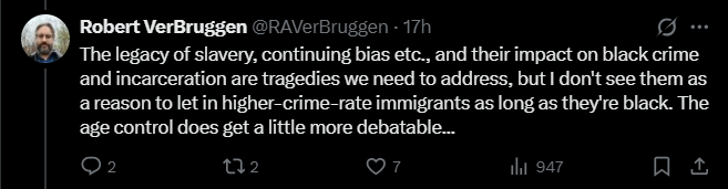 MI scholars narrow their comparison to males aged 18–29, a defensible choice given age and sex differences in incarceration rates. They then note that “crime and incarceration rates differ sharply by race in the United States,” but do not include race in the analysis. When I asked one of the MI authors about the choice to compare by duration in the US, age, and sex, but not race, he said it was because of the legacy of slavery and racism that black Americans have suffered. That’s not an answer to my question, but I did not expect an MI scholar to credit the relatively high black American incarceration rate on the legacies of slavery and racism. Now I’ve seen everything, and it’s less than two weeks into 2026.