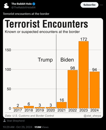 Terrorists crossing the border is a major talking point in the 2024 political campaign for president. Trump won’t stop talking about the number of terrorists who have crossed the border during the Biden administration, and Republican members of Congress have held so many hearings on the topic that I've lost count, although I've testified at two of them. The entire argument rests on the elevated number of border crossers who are on the terrorism screening dataset (TSDS) since Biden took office, as seen in the chart below, which has almost 18 million views on X so far.