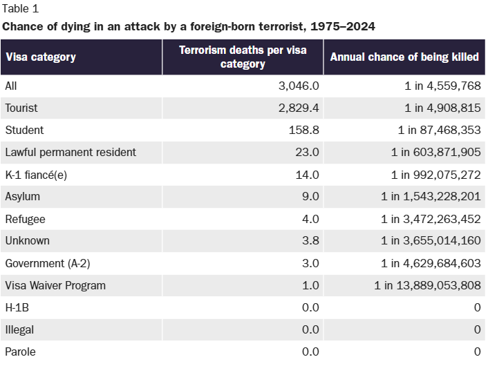 President Trump announced that he’s banning almost all travel and immigration from Afghanistan, Burma, Chad, the Republic of Congo, Equatorial Guinea, Eritrea, Haiti, Iran, Libya, Somalia, Sudan, and Yemen for “terrorism-related and public-safety risks.” There are some exceptions for adoptions, immediate family members of US citizens, and a handful of other visas. A single terrorist from those countries murdered one person in an attack on US soil: Emanuel Kidega Samson from Sudan, who committed an attack motivated by anti-white animus in 2017. The annual chance of being murdered by a terrorist from one of the banned countries from 1975 to the end of 2024 was about 1 in 13.9 billion per year.